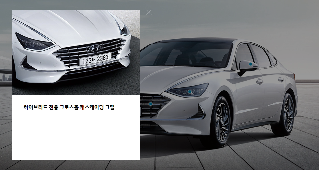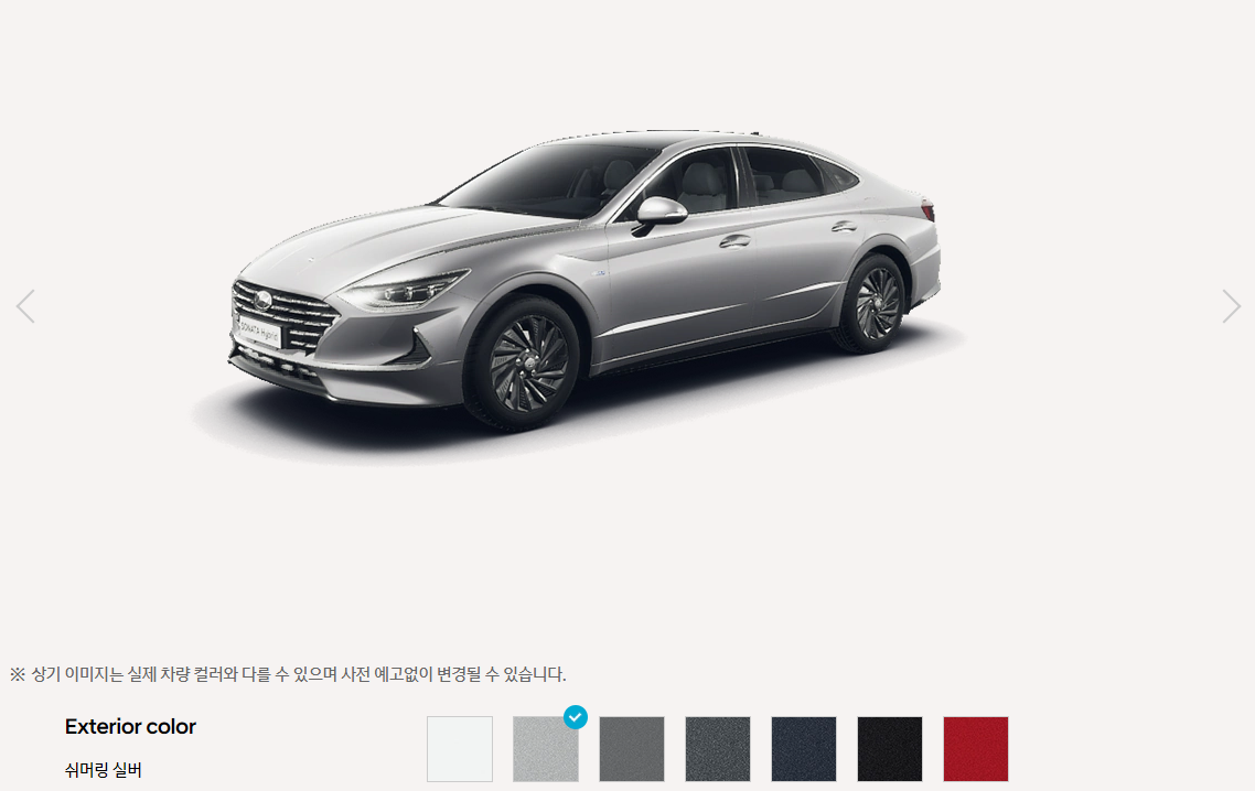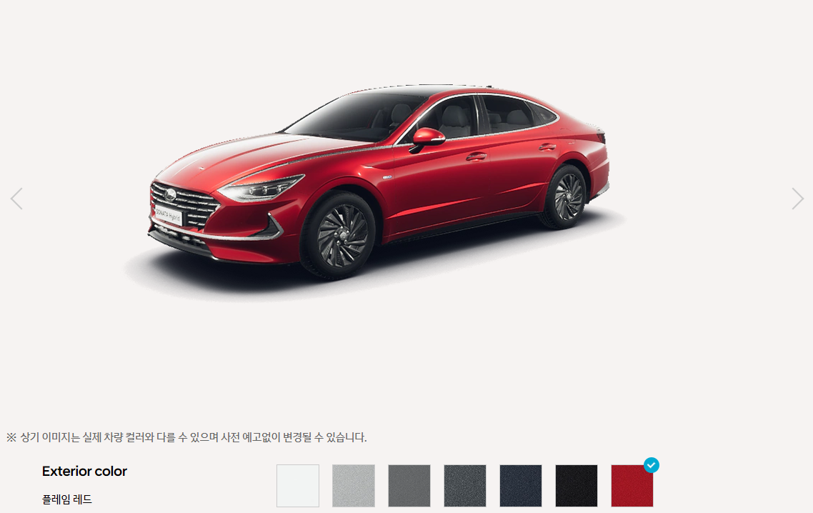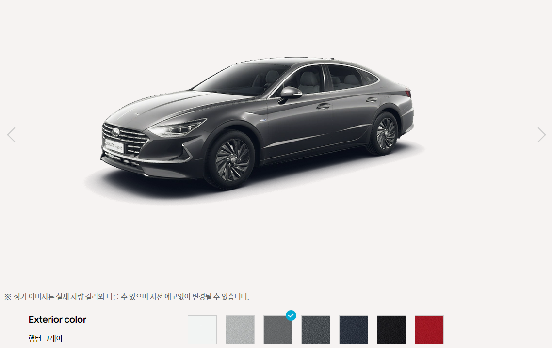 쏘나타 하이브리드 색상은 총 7가지 입니다. 화이트 크림, 쉬머링 실버, 햄턴 그레이, 녹턴 그레이, 옥스포드 블루, 미드나잇 블랙, 플레임 레드 입니다. 하단 상세 이미지 입니다.