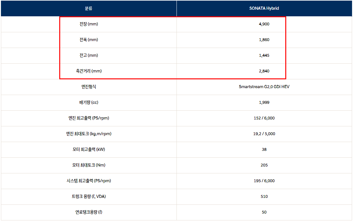 쏘나타 하이브리드 제원 및 요약