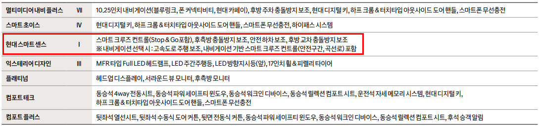 각 트림별로 업그레이드 되는 사항 중 지능형안전기술은 운전자의 운전 시 안전성을 높여주는 안전기술 입니다. 선택 품목으로도 모든 트림에 따로 적용이 가능하니 참고 하시기 바랍니다.