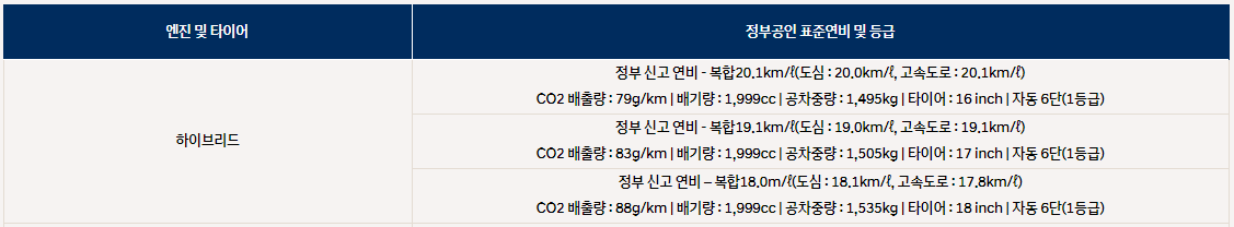 타이어의 인치에 따라서 18km/l~20.1kml/ 으로 차이가 납니다. 연비를 가장 중요하게 생각하시는 분들은 하이브리드가 확실히 좋다고 생각합니다.