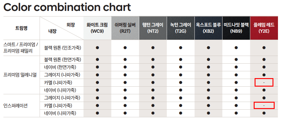 모든 트림과 색상에 적용이 되는 것이 아니기 때문에 적용이 불가한 조합을 하단의 이미지에서 안내드리겠습니다. 해당 부분을 참고 하시면 선택에 도움이 되실 겁니다.