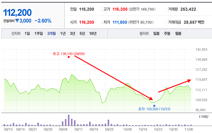 현재 주가와 과거 주가는 기간별로 확인 하시면 좋습니다. 현재 주가는 1일 주가로 사용하시고 3개월 주가는 단기간의 흐름을 보시면 됩니다. 1년치 주가는 위에서 공부한 사업현황과 기업정보와 흐름이 일치하는 판단해보는 자료로 쓰시면 됩니다.