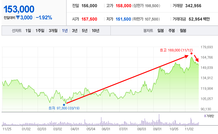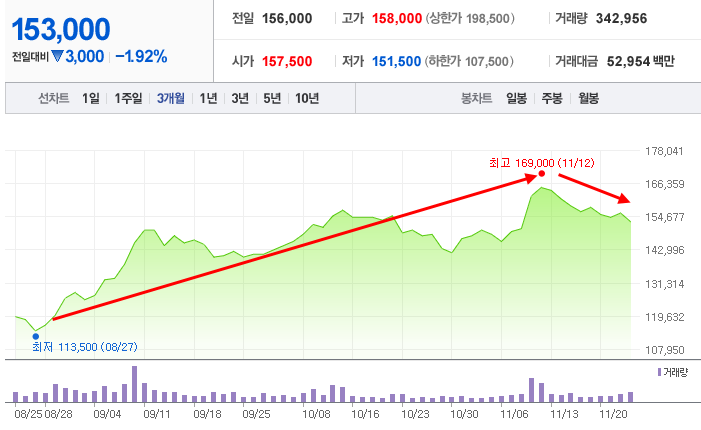 현재 주가와 과거 주가는 기간별로 확인 하시면 좋습니다. 현재 주가는 금일 주가 확인용으로 사용하ㅓ시고 3개월 주가는 단기간의 흐름을 파악하는 자료로 활용하시기 바랍니다. 1년간 주가는 위에서 분석하고 공부한 기업정보와 사업현황을 토대로 흐름이 일치하는지 또는 어떤 점에서 등락이 있었는지를 확인 하시는 자료로 사용 하시면 됩니다.