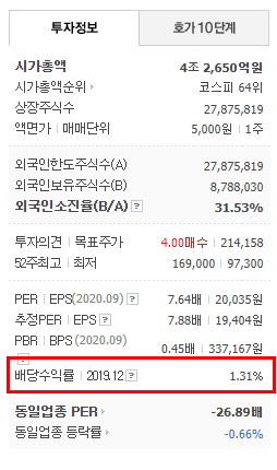 먼저 배당율을 살펴 보겠습니다. 2019년 12월 기준 1.31% 으로 높지는 않습니다. 아래의 표를 보시면 됩니다.