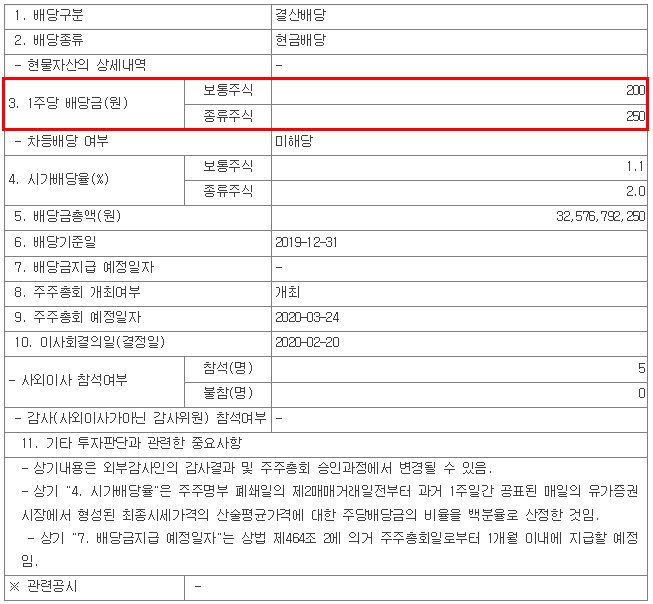 배당 수익률은 0.42% 입니다. 한화솔루션은 현금배당 입니다. 1주당 배당금은 보통주 기준으로 200원 입니다. 우선주 배당금은 50원 높은 250원 입니다. 자세한 내용은 하단의 이미지를 보시겠습니다.