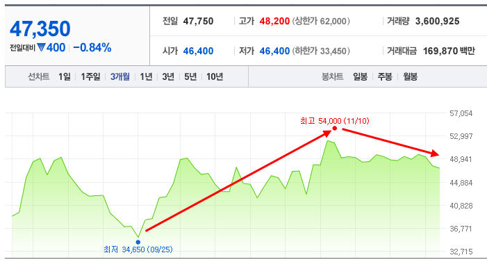 현재 주가와 과거 주가는 기간별로 확인 하시면 좋습니다. 현재 주가는 금일 주가 확인용으로 사용하시고 3개월 주가는 단기간의 흐름을 파악하는 자료로 활용하시기 바랍니다. 1년간 주가는 위에서 분석하고 공부한 기업정보와 사업현황을 토대로 흐름이 일치하는지 또는 어떤 점에서 등락이 있었는지를 넓게 확인 하시는 자료로 사용 하시면 됩니다.