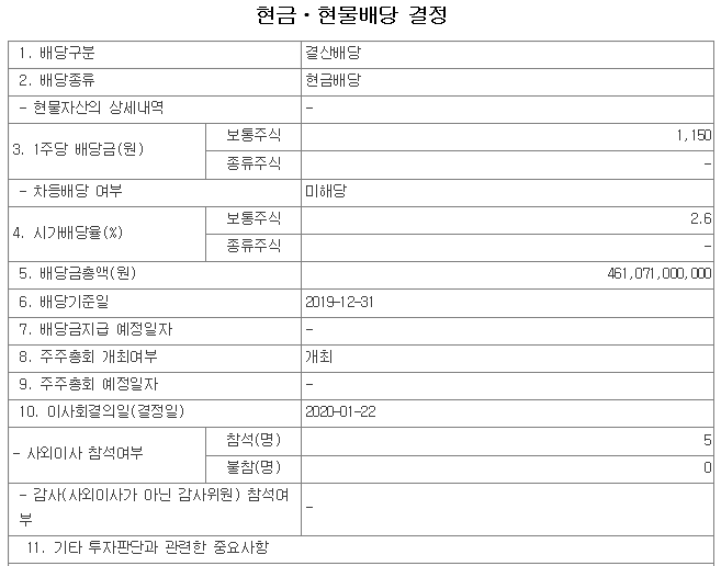 배당 기준일은 19년 12월 31일 입니다. 위의 자료 확인하시고 1,150원 배당금 입니다. 참고 하시기 바랍니다.