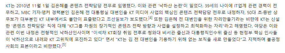 그리고 또 다른 논란은 KT전무 낙하산 임명 논란 입니다.