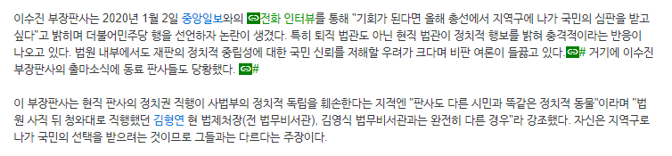 누구나 그렇듯 한두가지 비판과 논란이 있었습니다. 머넞 현직 판사의 정치적 직행 논란에 대한 비판을 받은 바 있습니다. 내용은 아래와 같습니다.