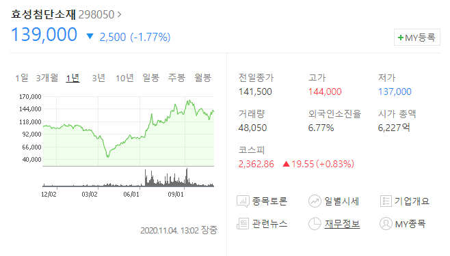 20년 6월 기준으로 작년 대비 매출액은 33.22% 감소 했습니다. 영업이익 적자전환, 당기순이익 적자전환 하였습니다. 하지만 에어백용 원단과 폴리에스터 타이어코드 안전벨트용 원사 그리고 자동차용 카페크 사업 부분은 자동차 시장의 성장이 예상되면서 같이 성장할 것으로 분석 됩니다. 그리고 아라미드, 탄소섬유와 신소재제품 개발 등 사업 다각화로 추후 성장 가능성을 예상 할 수 있습니다.