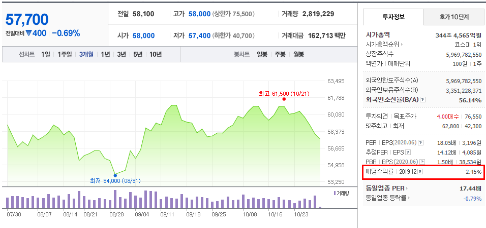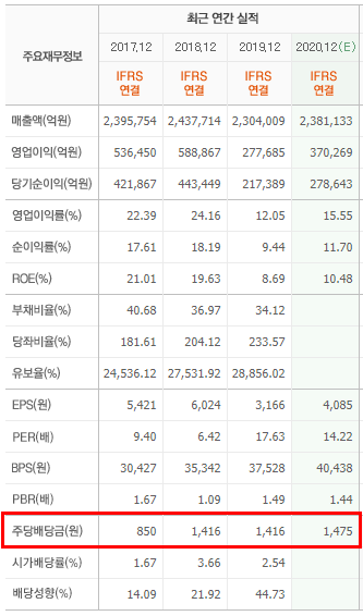 1주당 보통주식 354원 입니다. 배당금총액은 2조4천원 정도 입니다. 배당율은 0.6%입니다. 위에서 말씀 드렸듯이 배당기준일을 보셔야 합니다. 2020년 9월 30일 소유 기준으로 배당이 지급되니 꼭 체크 하시기 바랍니다.