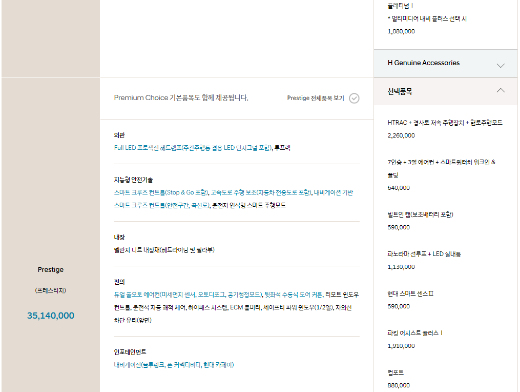 프레스티지 : 35,140,000원 - 외관, 지능형 안전기술, 내장, 편의, 인포테인먼트 업그레이드