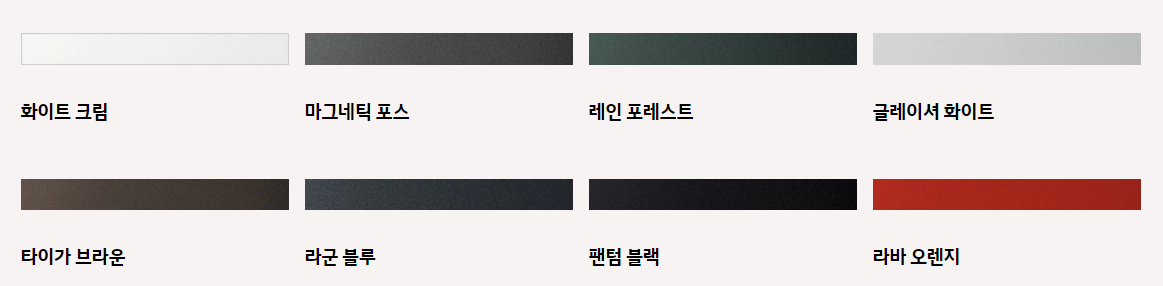 더 뉴 싼타페는 총 8가지 색상으로 선택이 가능 합니다. 화이트 크림, 마그네틱 포스, 레인 포레스트, 글레이셔 화이트, 타이가 브라운, 라군 블루, 팬텀 블랙, 라바 오렌지 입니다.