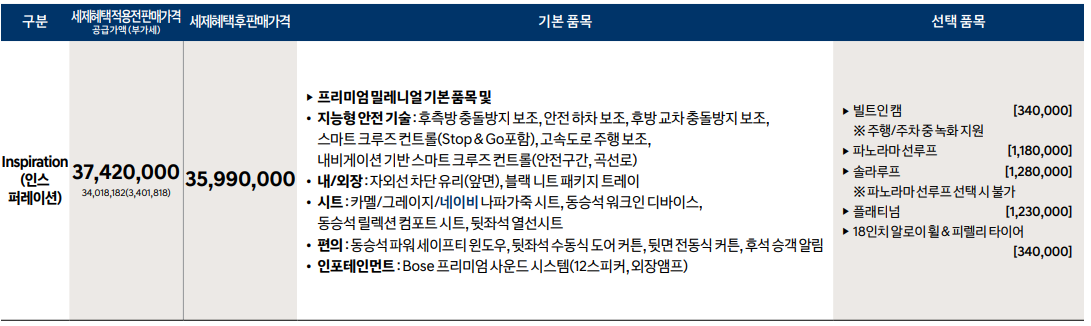 인스퍼레이션 : 37,420,000원 - 지능형안전기술, 내/외장, 시트, 편의, 인포테인먼트 업그레이드
