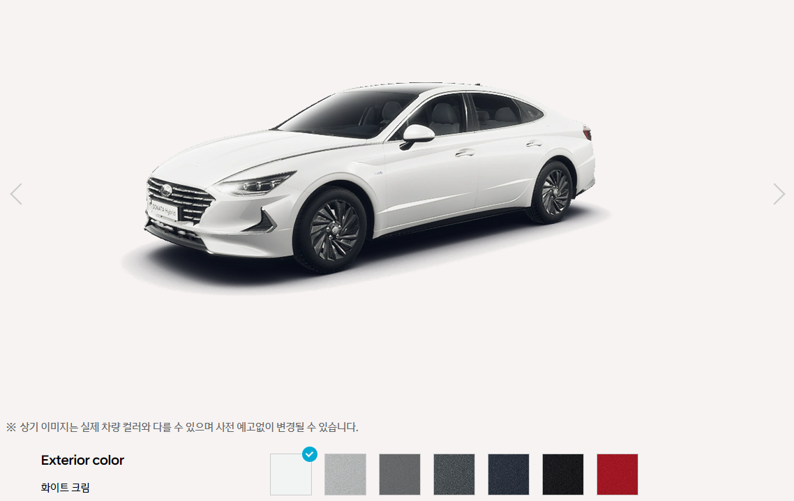 쏘나타 하이브리드 색상은 총 7가지 입니다. 화이트 크림, 쉬머링 실버, 햄턴 그레이, 녹턴 그레이, 옥스포드 블루, 미드나잇 블랙, 플레임 레드 입니다. 하단 상세 이미지 입니다.