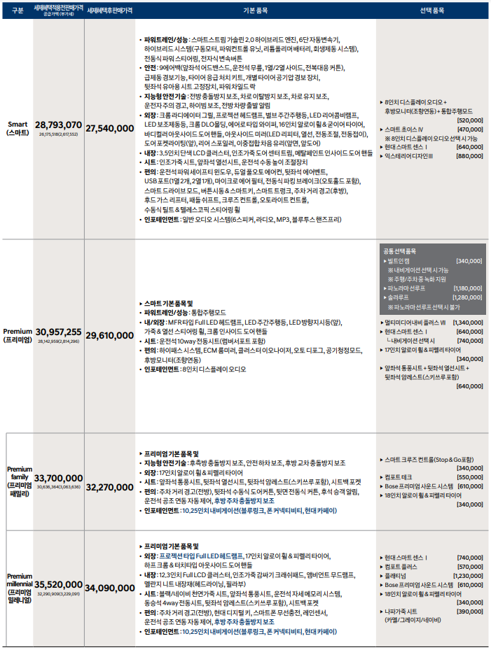 쏘나타 하이브리드 트림별 가격 및 가격표