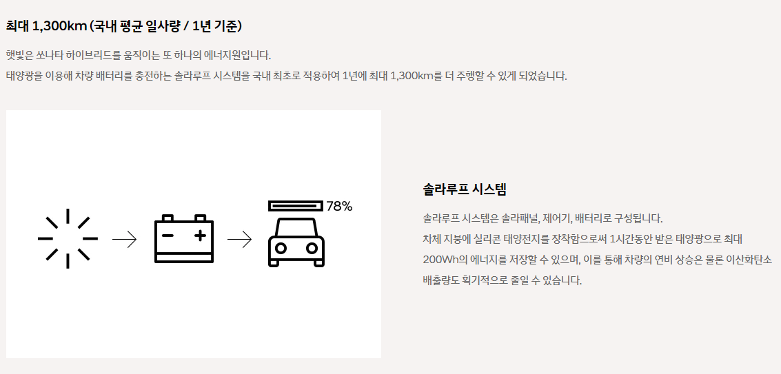 이번 쏘나타 하이브리드는 최초로 솔라루프 시스템을 적용 하였습니다. 그리고 세계 최초 능동변속제어 기술을 적용시켜 기술적으로 한단계 업그레이드 되었습니다.