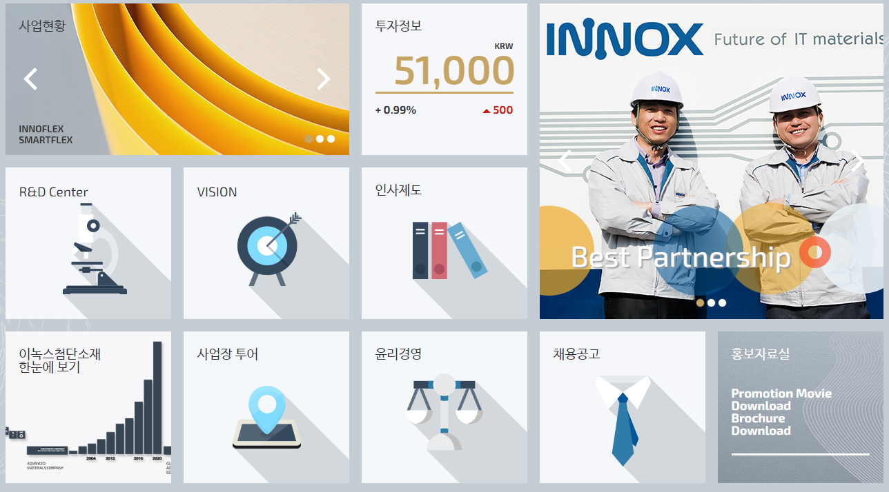 이녹스 첨단소재는 고분자 합성 IT 필름 소재 업체 입니다. OLED와 FPCB 그리고 반도체 산업에 영위하고 있습니다. 총 4개의 사업부로 나누어져있습니다. Innoflex, Smartflex, Innosem, Innoled 입니다.