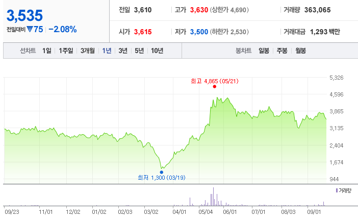 최근 한달 중 5일 동안 검색 상위 종목에 랭크되면서 21일 오전에는 전일 보다 0.7% 오른 4,380원에 거래가 되고 있습니다. 해당 지수는 지난 8월 24일 약 한달 전 대비 44.33% 상승한 수치 입니다.