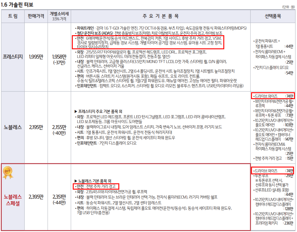 노블레스 스페셜 : 2,395만 - 안전, 외장, 내장, 시트, 편의 업그레이드