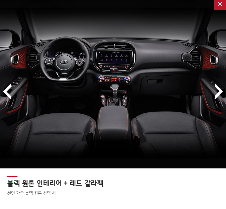 다음은 쏘울 내부 인테리어 입니다. 총 3가지로 블랙, 브라운, 레드 칼라팩 인테리어로 선택 가능 합니다. (단, 브라운 인테리어는 노블레스 스페셜 선택 가능, 레드 칼라팩은 노블레스 스페셜 프리미엄 패키지 추가시 적용 가능 합니다.)