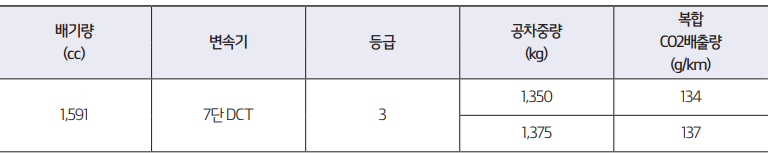 출시가는 19,580,000원 기본 트림 가격입니다. 최대 23,510,000원이 최고급 트림 가격입니다. 복합연비는 12.4km/l로 트림별로 약간의 차이가 있습니다. 배기량은 1,591cc 이며, 약 1,600cc라고 보시면 됩니다. 연료방식은 가솔린 방식만 판매되고있습니다.