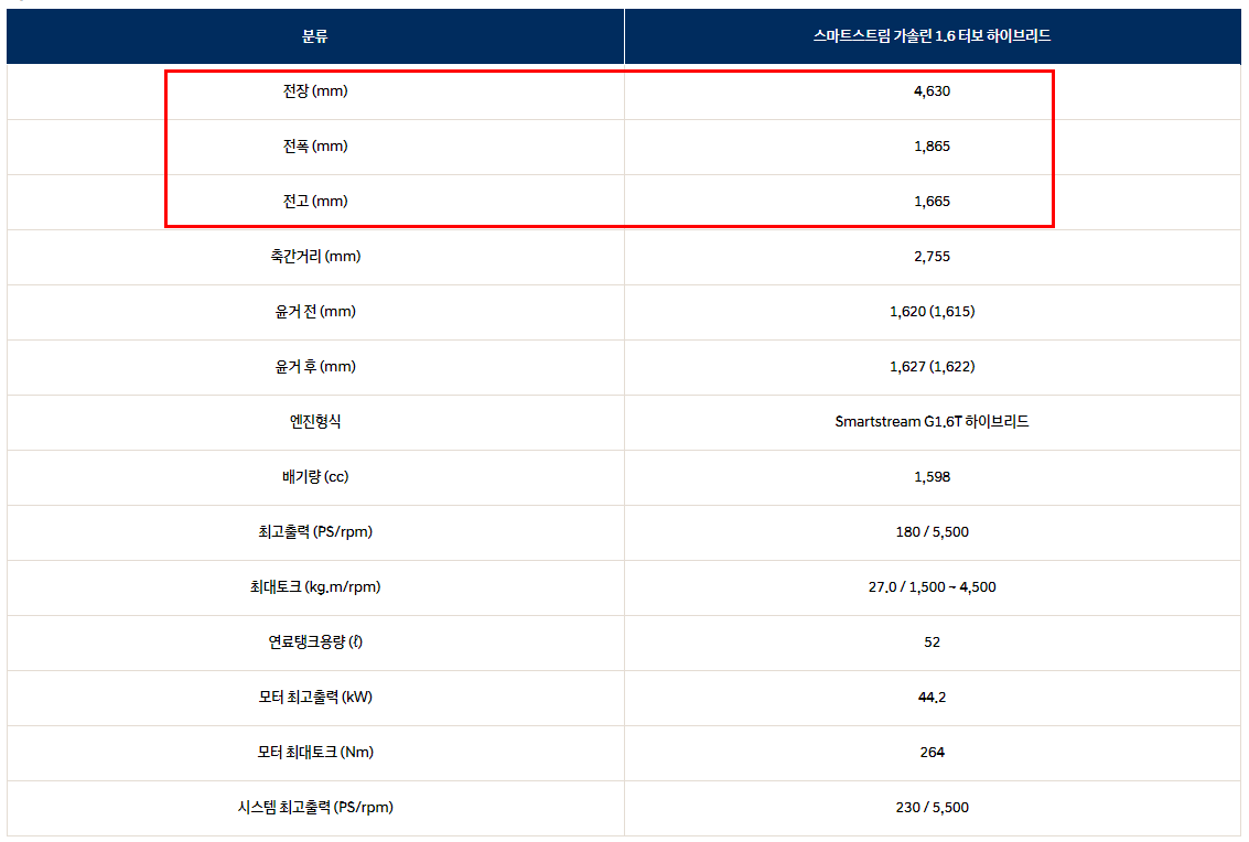상세하게 가격 및 다양한 정보를 알아보기 전에 투싼 하이브리드 제원 및 요약을 간단하게 해보도록 하겠습니다. 하단의 이미지를 봐주시기 바랍니다.