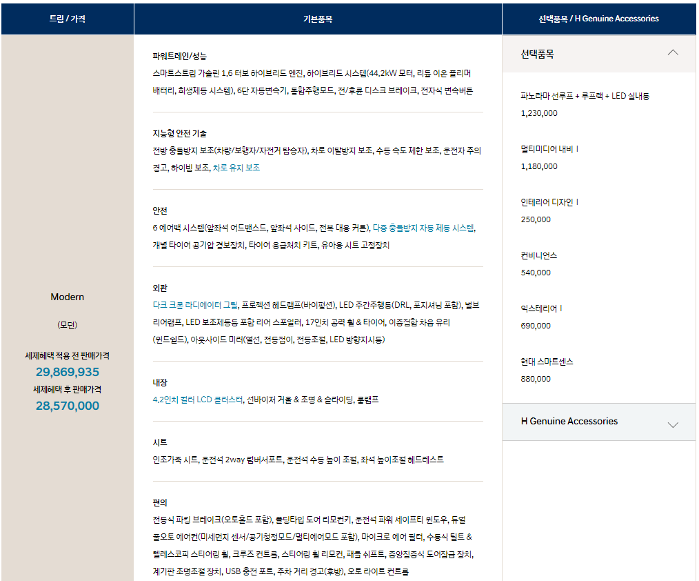 가장 중요한 가격 및 가격표 알아보도록 하겠습니다. 하이브리드이기 때문에 일반 차량과의 가격차이는 확실히 있으나 그만큼의 매리트가 있는 것은 확실합니다. 바로 확인 해보겠습니다. 하단의 봐주시기 바랍니다.