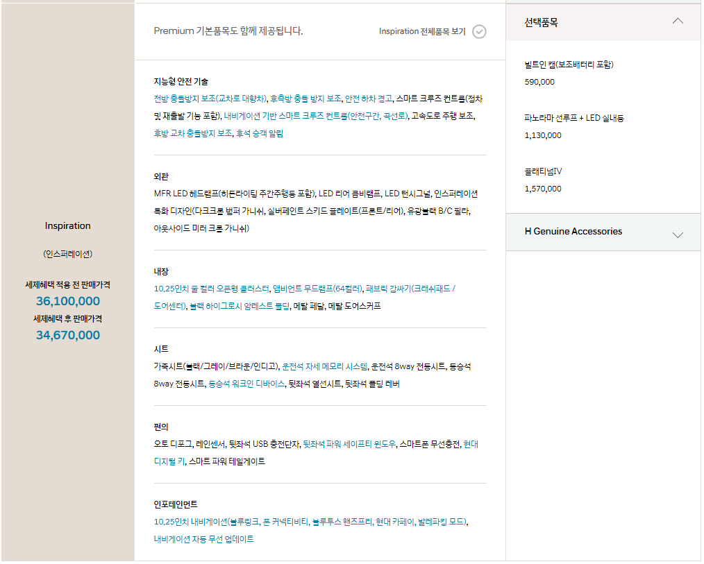 인스퍼레이션 : 34,670,000원 - 프리미엄을 기본으로 함. 지능형 안전기술, 외관, 내장, 시트, 편의, 인포테인먼트 업그레이드