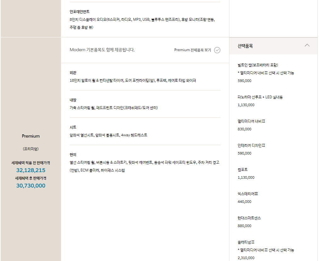 프리미엄 : 30,790,000원 - 모던트림을 기본으로 함. 외관, 내장, 시트, 편의 업그레이드