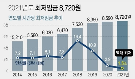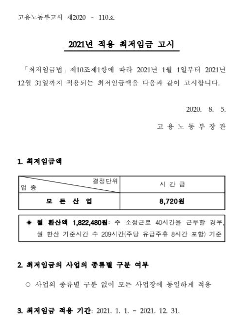 작년 최저임금은 8,590원 이었습니다. 올해 최저임금은 130원 상승하여 8,720원으로 결정되었습니다. 코로나로 인해 경제가 어려워지면서 상승폭이 다소 낮은것으로 판단이 됩니다. 하단의 이미지는 고용노동부 최저임금 고시 입니다.