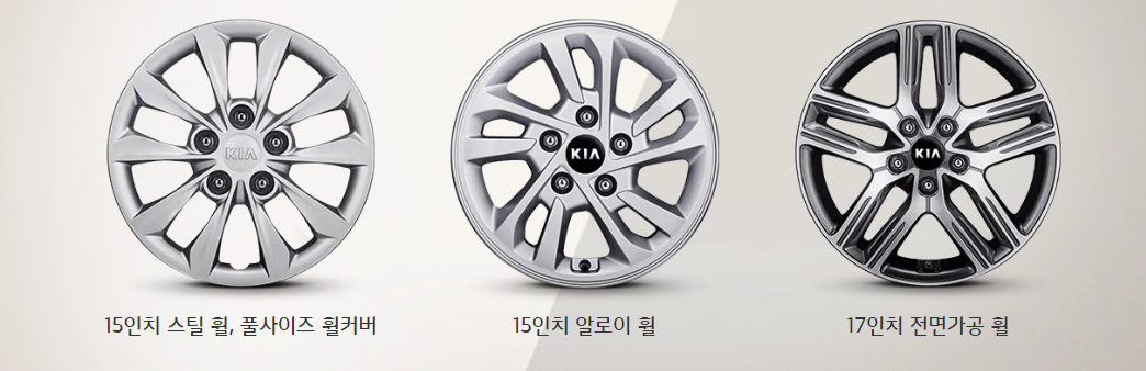 K3 휠은 총 3가지로 선택 가능합니다. 15인치 스틸휠, 풀사이즈 휠커버, 15인치 알로이 휠, 17인치 전면 가공 휠 입니다. 원하시는 디자인으로 선택 가능하며 추가 옵션이기에 비용은 추가 됩니다.