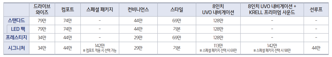 시그니처 - 21,800,000원 ▶ 프레스티지를 기본으로 외장/내장/시트/편의 옵션이 추가 됩니다.