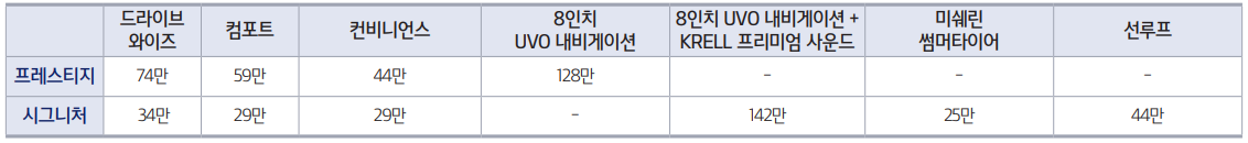 시그니처 - 25,600,000원 ▶ 프레스티지를 기본으로 첨단 운전자 보조(ADAS)/안전/외장/내장/시트/편의 옵션이 추가 됩니다.