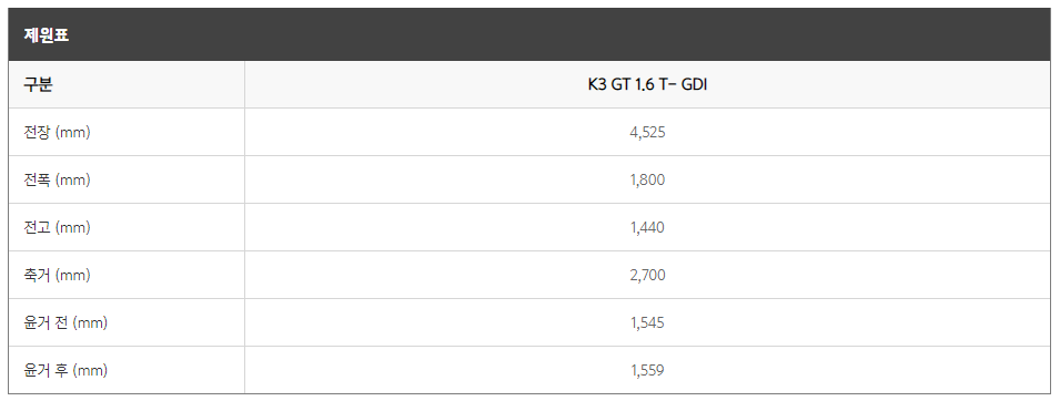 가장 먼저 알아볼 상세 정보는 차량의 제원 입니다. 전체적으로 제원을 확인 하셔야 내가 구매하려는 차량의 크기 및 성능이 내가 원하는 수준인지를 먼저 가름할 수 있습니다. K3랑 비교해서 살펴보시면 더욱 좋습니다.