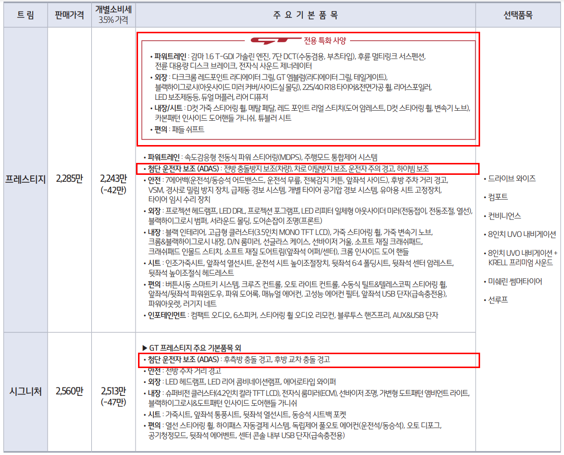프레스티지 - 22,850,000원 ▶ 스탠드한 트림이며 GT전용 특화 사양이 및 첨단 운전자 보조(ADAS)가 포함되어 있습니다.
