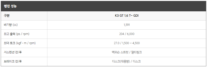 K3 GT 엔진은 GT 1.6 T-GDI 엔진을 사용하고 있습니다. 위의 퍼포먼스 패키지를 통해 스포티함과 다이내믹함을 더했습니다. 배기량은 1,591cc 입니다. 최고출력은 204ps/6,000rpm 입니다.