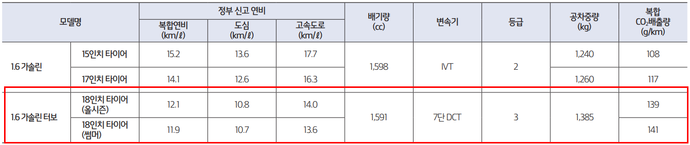 마지막으로 K3 GT 공인연비 및 휠 정보 입니다. 타이어 인치에 따라 약간의 차이가 있으니 연비를 신경 쓰시는 분들은 하단의 이미지를 잘 참고 해주시기 바랍니다.