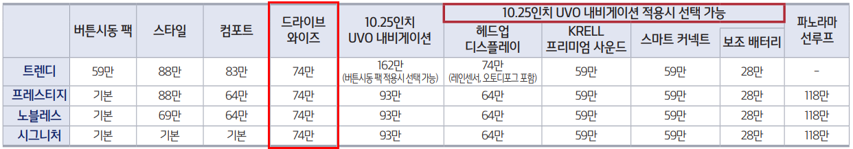 위의 선택 옵션표에서 원하시는 옵션의 가격을 확인 하시면 됩니다. 구매하시려는 트림에 해당 가격을 추가 하시면 됩니다. 상세 옵션표는 하단에서 안내해 드리겠습니다.