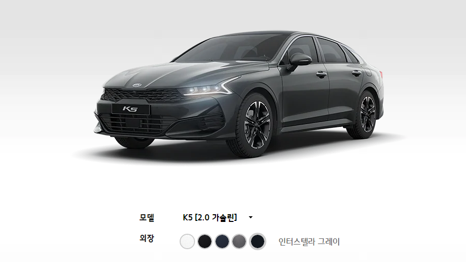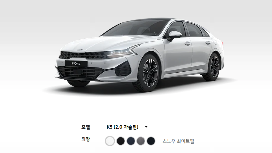다음으로 알아 볼 정보는 색상 입니다. 차량을 선택하는 중요한 요인 중 하나가 바로 외부 색상 및 인테리어 입니다. 2021 K5은 총 6가지로 색상 선택이 가능 합니다. 트림별 전용 선택 가능 컬러가 있으니 참고 하시기 바랍니다.
