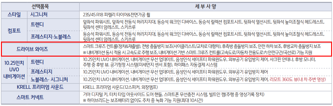 드라이브 와이즈는 운전자의 안정성을 높여주는 주요 기능 입니다. 하단에서 해당 옵션의 상세내용을 보시고 선택하시면 좋습니다. 그 외에 필요한 옵셩는 자신이 커스터마이징 하고 싶은 옵션을 추가 하시면 됩니다.