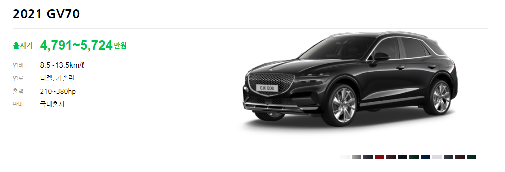 지금까지 2021 GV70 대해서 가격 및 가격표 / 옵션, 옵션표 제원 연비 색상 등 다양하게 알아보았습니다. 차량을 구매하시 전 차량의 정보는 많이 알수록 좋습니다. 위의 자료를 잘 참고 하시고 매장을 직접 방문 하시어 시승 및 상담을 받으시고 구매 진행 하실 추천 드립니다. 감사합니다.