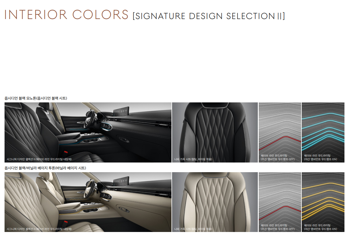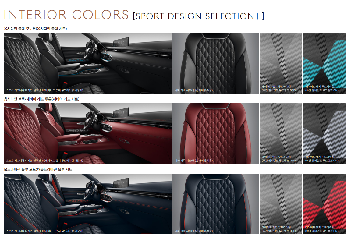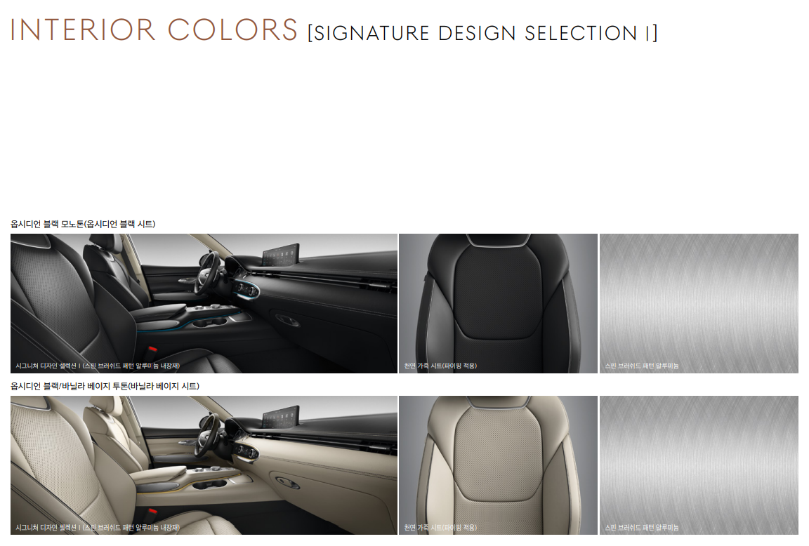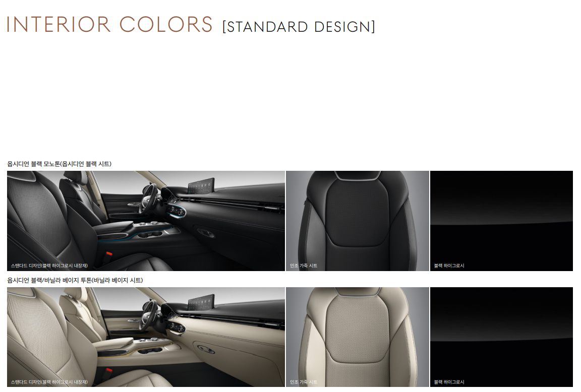 이번 항목은 GV70 내부 색상 및 인테리어 입니다. 내부 인테리어는 스탠다드, 시그니처1, 시그니처2, 스포츠 스탠다드, 스포츠1, 스포츠2로 내부 색상이 분류되어 선택 가능 합니다. 원하시는 분류에 따라 선택 가능한 색상이 다르니 참고 하시기 바랍니다.