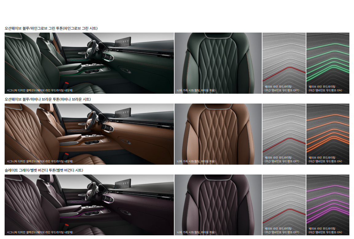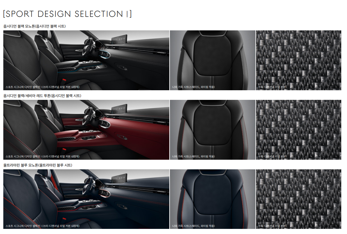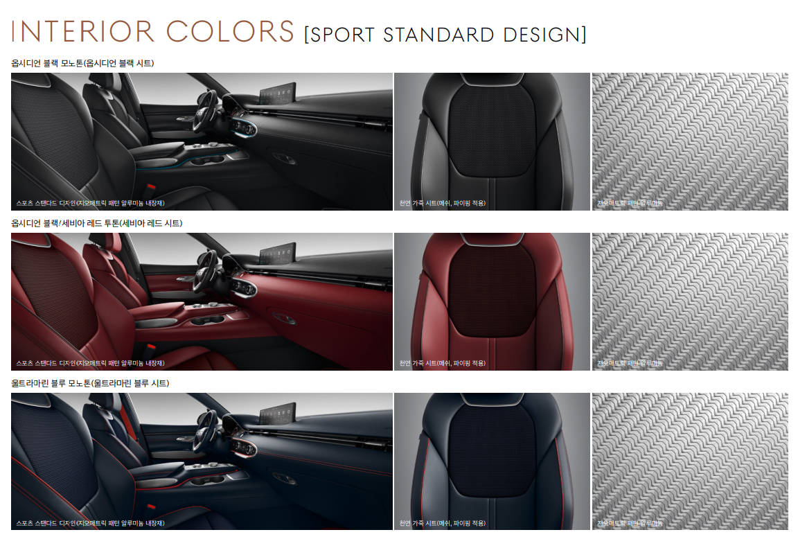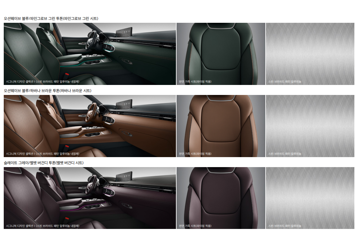 이번 항목은 GV70 내부 색상 및 인테리어 입니다. 내부 인테리어는 스탠다드, 시그니처1, 시그니처2, 스포츠 스탠다드, 스포츠1, 스포츠2로 내부 색상이 분류되어 선택 가능 합니다. 원하시는 분류에 따라 선택 가능한 색상이 다르니 참고 하시기 바랍니다.