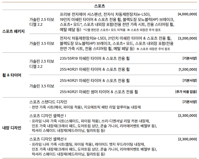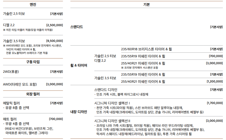 엔진은 가솔린 2.5터보를 기본으로 디젤 2.2, 가솔린 3.5 터보로 분류되며 디젤과 가솔린 3.5 선택 시 비용이 추가 되니 하단의 이미지를 봐주시기 바랍니다.