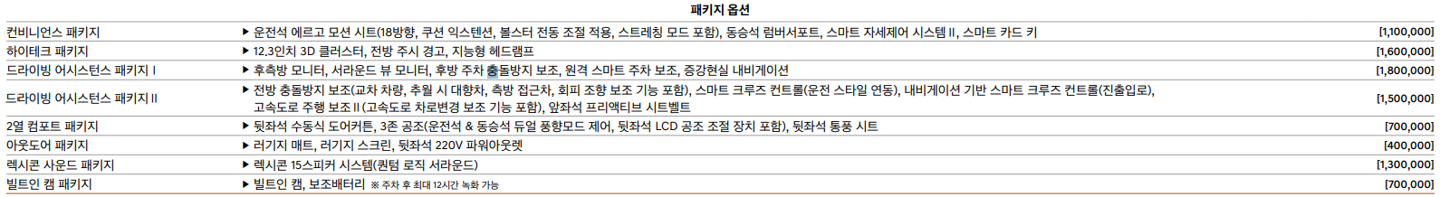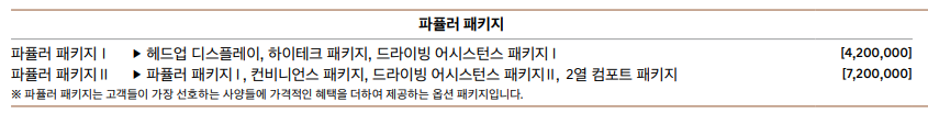 마지막으로 옵션 분류는 패키지 옵션 입니다. 패키로 옵션으로 가격적인 장점과 구매자의 선택의 폭을 넓혀주는 옵션 항목 입니다.