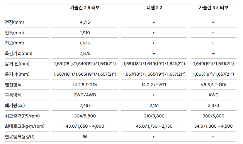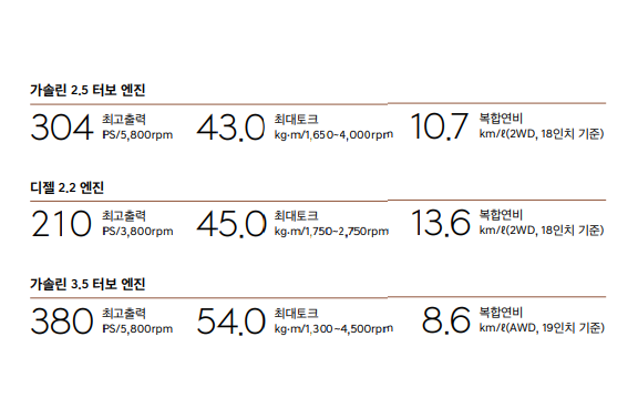 엔진은 가솔린 2.5 터보 엔진, 디젤 2.2 엔진, 가솔린 3.5 터보 엔진 3가지로 분류 됩니다. 엔진 별 최고출력 및 최대토크는 상단의 이미지를 참고 해주시기 바랍니다.