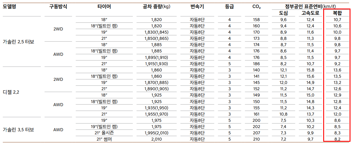 엔진 모델별, 구동방식과 타이어의 크기에 따라 복합연비가 다소 차이가 있으니 자세한 부분은 위의 표를 참고 해주시기 바랍니다.