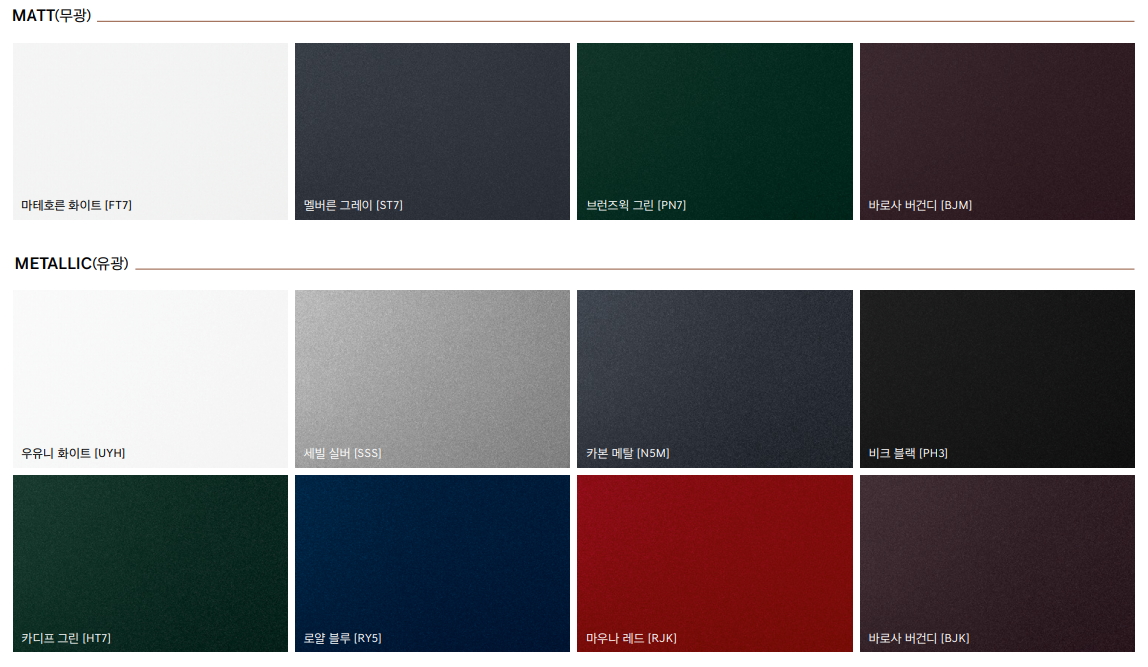 다음으로 알아 볼 정보는 색상 입니다. 차량을 선택하는 중요한 요인 중 하나가 바로 외부 색상 및 인테리어 입니다. 2021 GV70은 총 12가지로 색상 선택이 가능 합니다. 이 중 무광과 유광으로 분류 되니 하단의 이미지를 봐주시기 바랍니다.