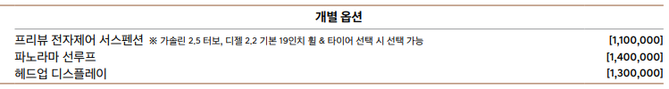 두 번째는 개별 옵션 입니다. 프리뷰 전자제어 서스펜션, 파노라마 선루프, 헤드업 디스플레이 선택 가능한 옵션 입니다.